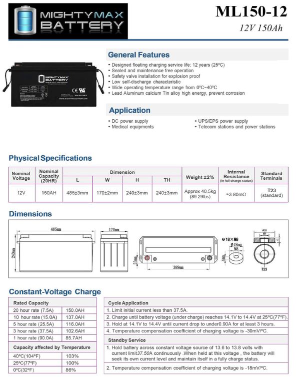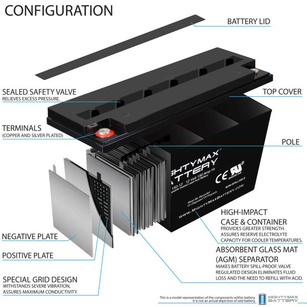 Delivering power when you need it, the Mighty Max ML150-12 12 Volt 150 AH uses a state of the art, heavy-duty, calcium-alloy grid that provides exceptional performance and service life in both float and cyclic applications.
