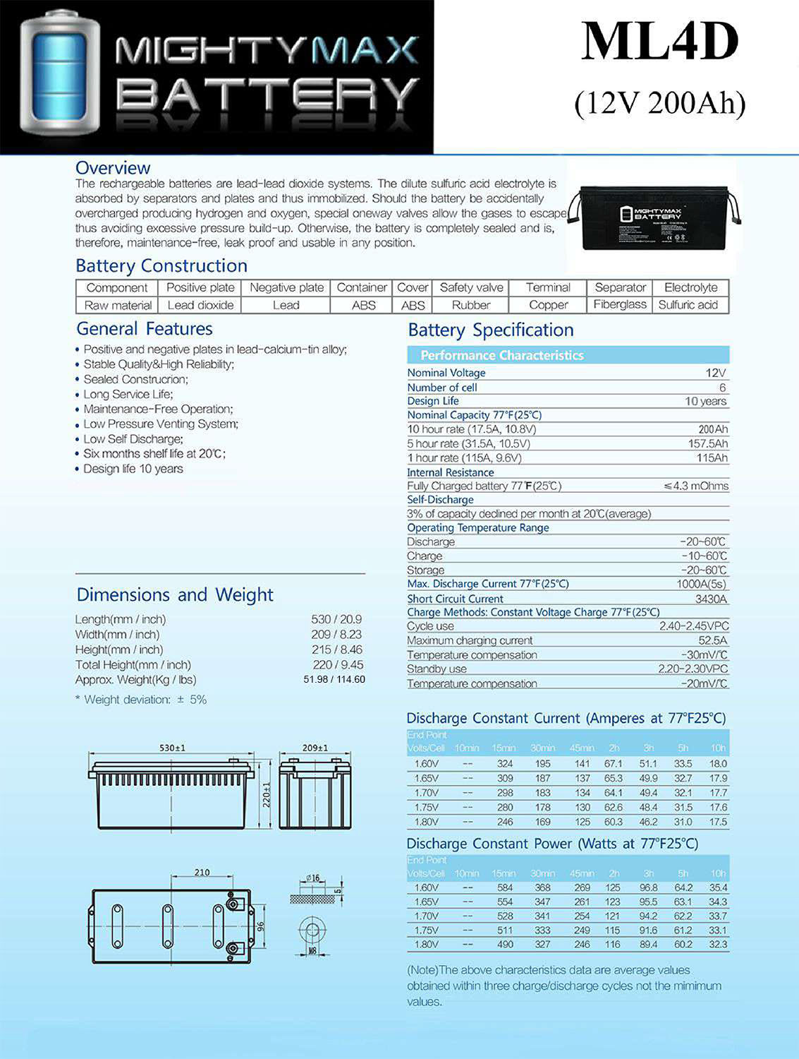 Delivering power when you need it, the Mighty Max ML4D 12 Volt 200 AH uses a state of the art, heavy-duty, calcium-alloy grid that provides exceptional performance and service life in both float and cyclic applications.
