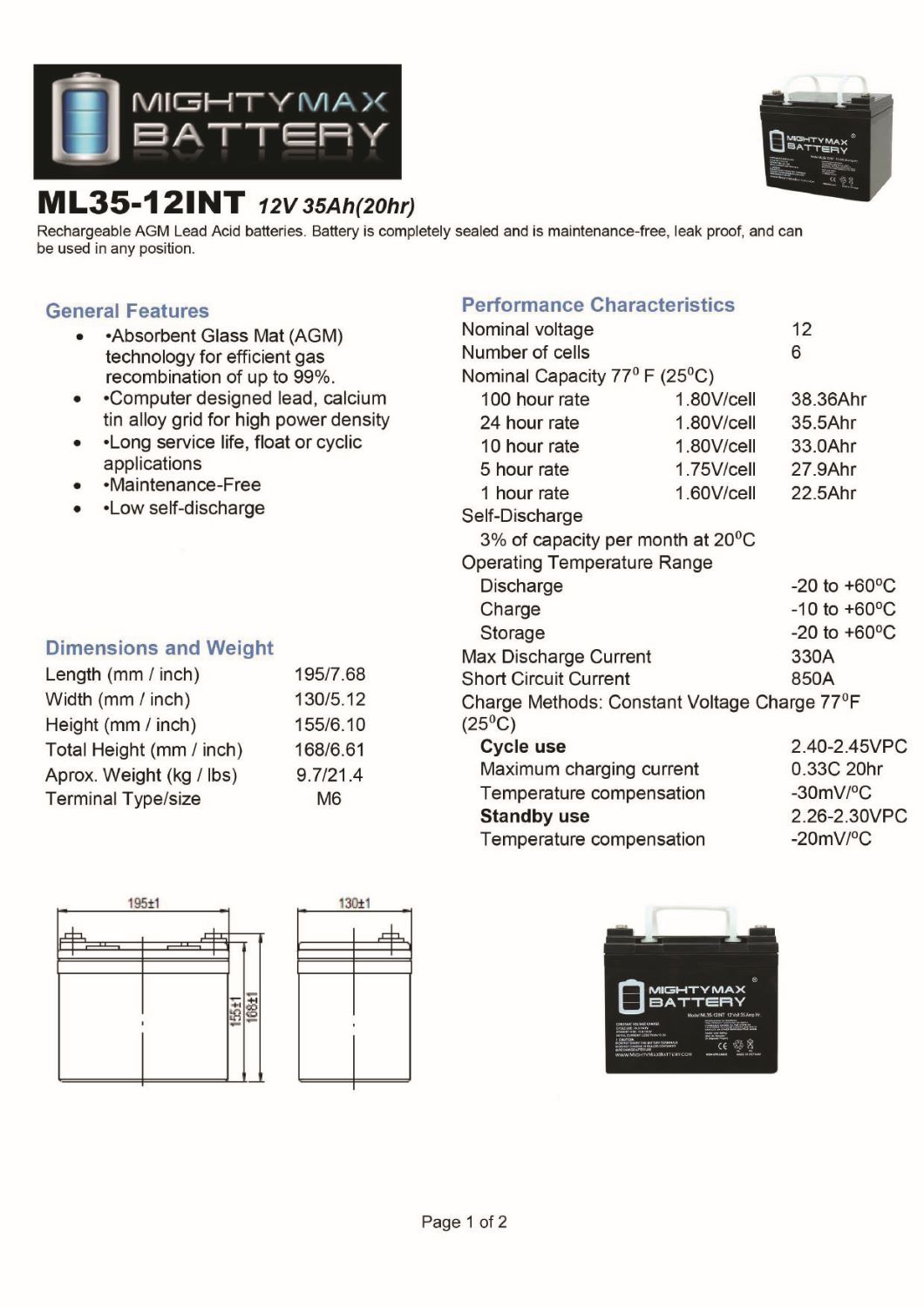 Delivering power when you need it, the Mighty Max ML35-12 Internal Thread 12 Volt 35 AH uses a state of the art, heavy-duty, calcium-alloy grid that provides exceptional performance and service life in both float and cyclic applications.