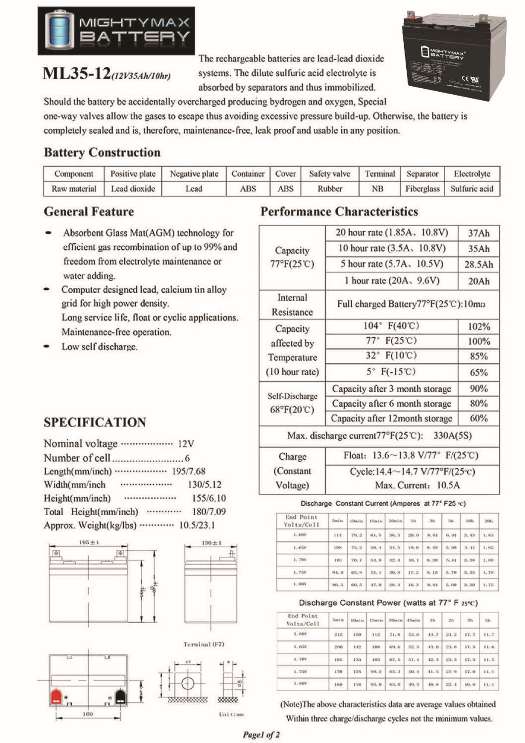 Delivering power when you need it, the Mighty Max ML35-12 12 Volt 35 AH uses a state of the art, heavy-duty, calcium-alloy grid that provides exceptional performance and service life in both float and cyclic applications.
