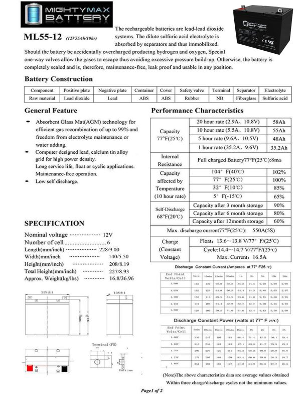 Delivering power when you need it, the Mighty Max ML55-12 12 Volt 55 AH uses a state of the art, heavy-duty, calcium-alloy grid that provides exceptional performance and service life in both float and cyclic applications.
