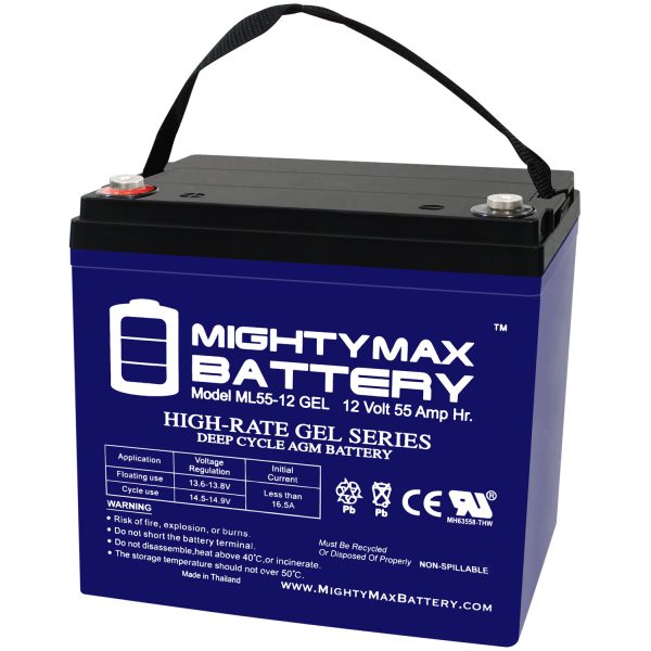 Delivering power when you need it, the Mighty Max ML55-12GEL 12 Volt 55 AH (Maintenance Free) battery. Requires no addition of water during the life of the battery. The Mighty Max ML55-12 GEL is a TRUE DEEP CYCLE battery that can be mounted in any position, requires no maintenance. When a Gel Cell battery is charged, no hazardous fumes escape the battery case, gases are processed within the battery itself.
