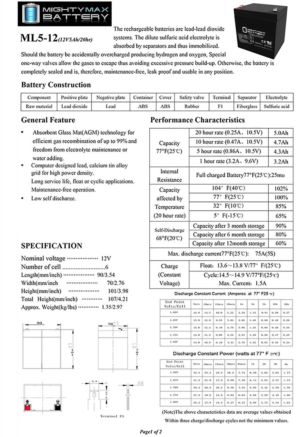 Delivering power when you need it, the Mighty Max ML5-12 12 Volt 5 AH uses a state of the art, heavy-duty, calcium-alloy grid that provides exceptional performance and service life in both float and cyclic applications.