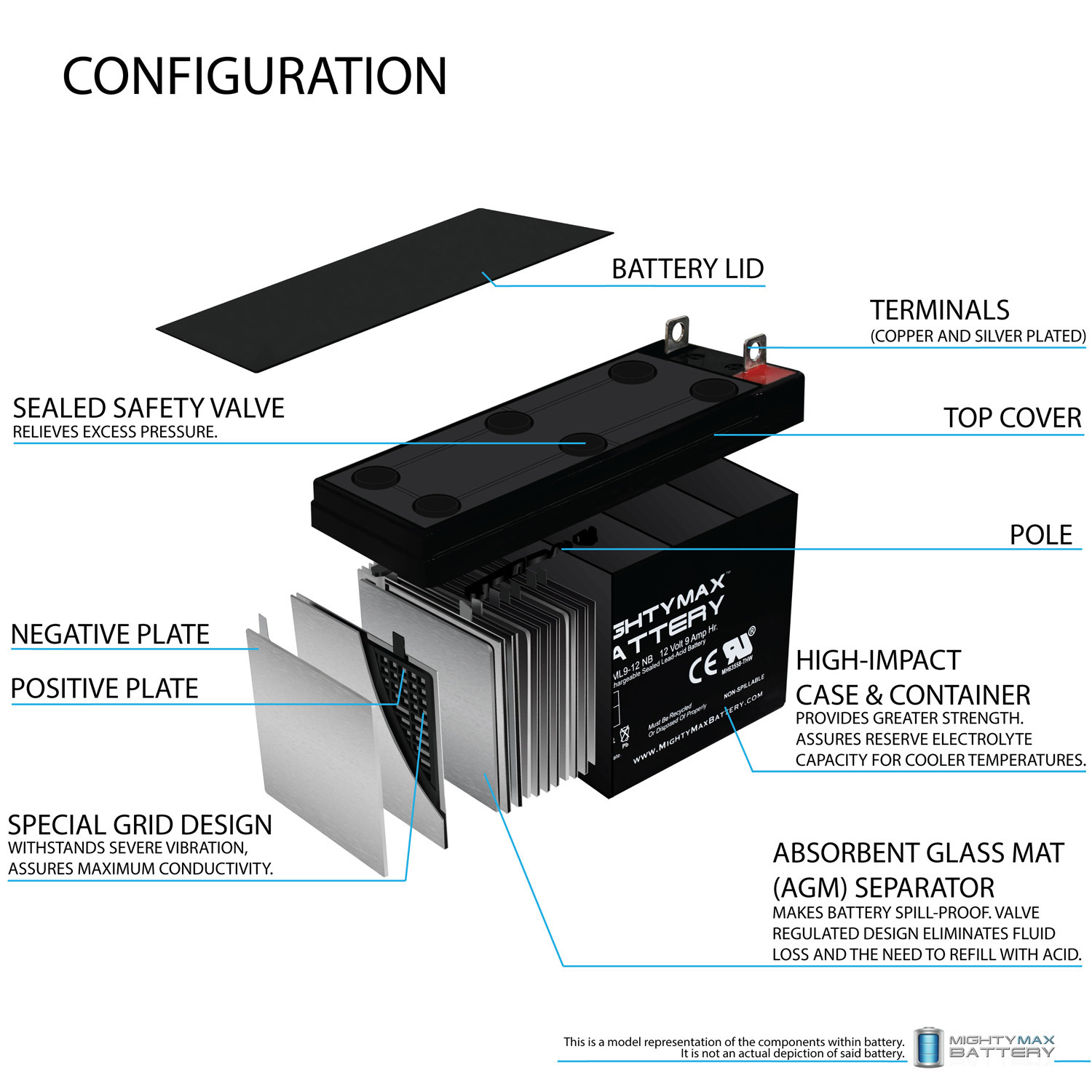 The ML9-12 is an Absorbent Glass Mat (AGM) technology with a valve regulated design, that can be used in enclosed and indoor environments without leaking or maintenance, providing a superior performance for thousands of models.
