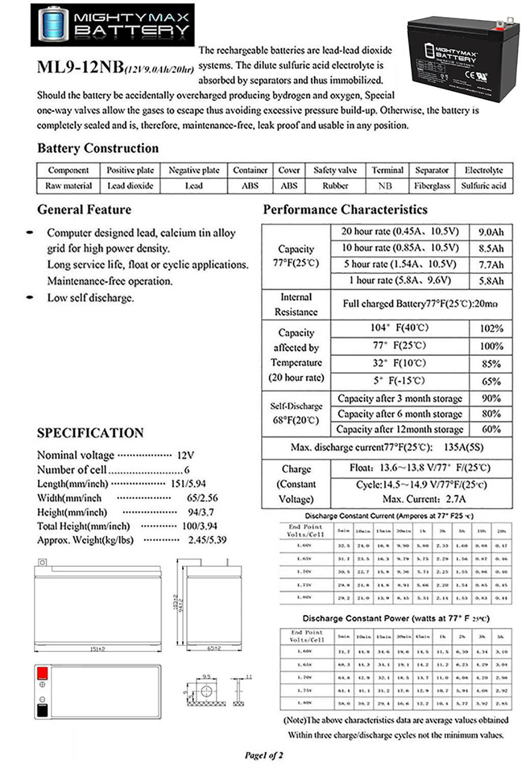 Delivering power when you need it, the Mighty Max ML9-12 12 Volt 9 AH uses a state of the art, heavy-duty, calcium-alloy grid that provides exceptional performance and service life in both float and cyclic applications.
