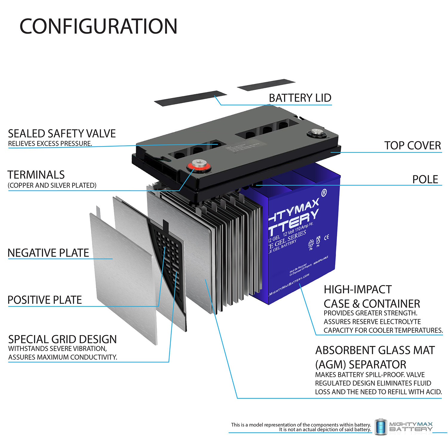Delivering power when you need it, the Mighty Max ML110-12GEL 12 Volt 110 AH (Maintenance Free) battery. Requires no addition of water during the life of the battery. The Mighty Max ML110-12 GEL is a TRUE DEEP CYCLE battery that can be mounted in any position, requires no maintenance. When a Gel Cell battery is charged, no hazardous fumes escape the battery case, gases are processed within the battery itself.