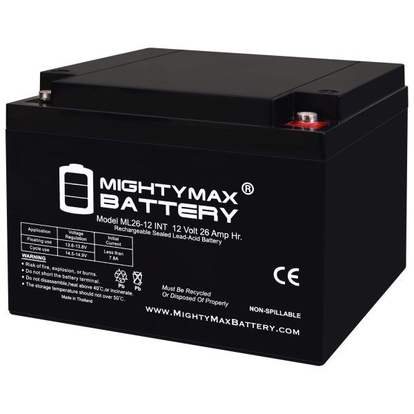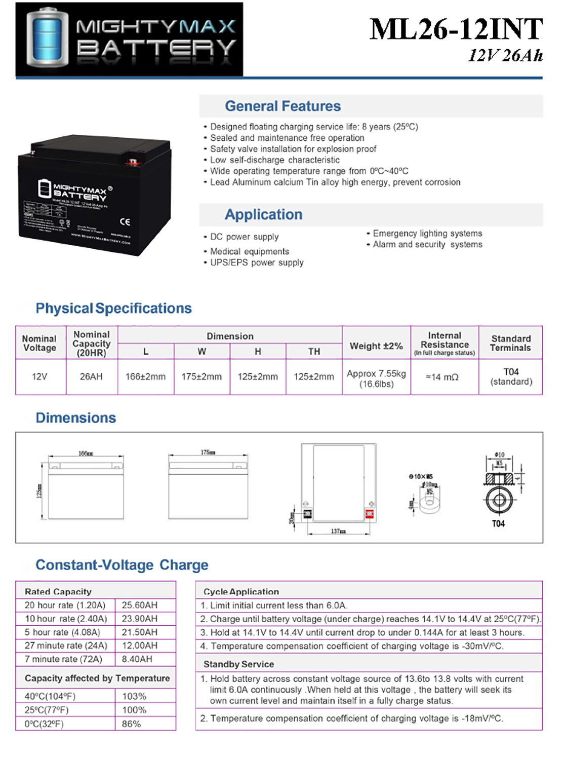 Delivering power when you need it, the Mighty Max ML26-12 Internal Thread 12 Volt 26 AH uses a state of the art, heavy-duty, calcium-alloy grid that provides exceptional performance and service life in both float and cyclic applications.