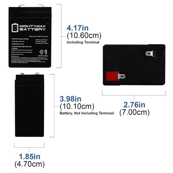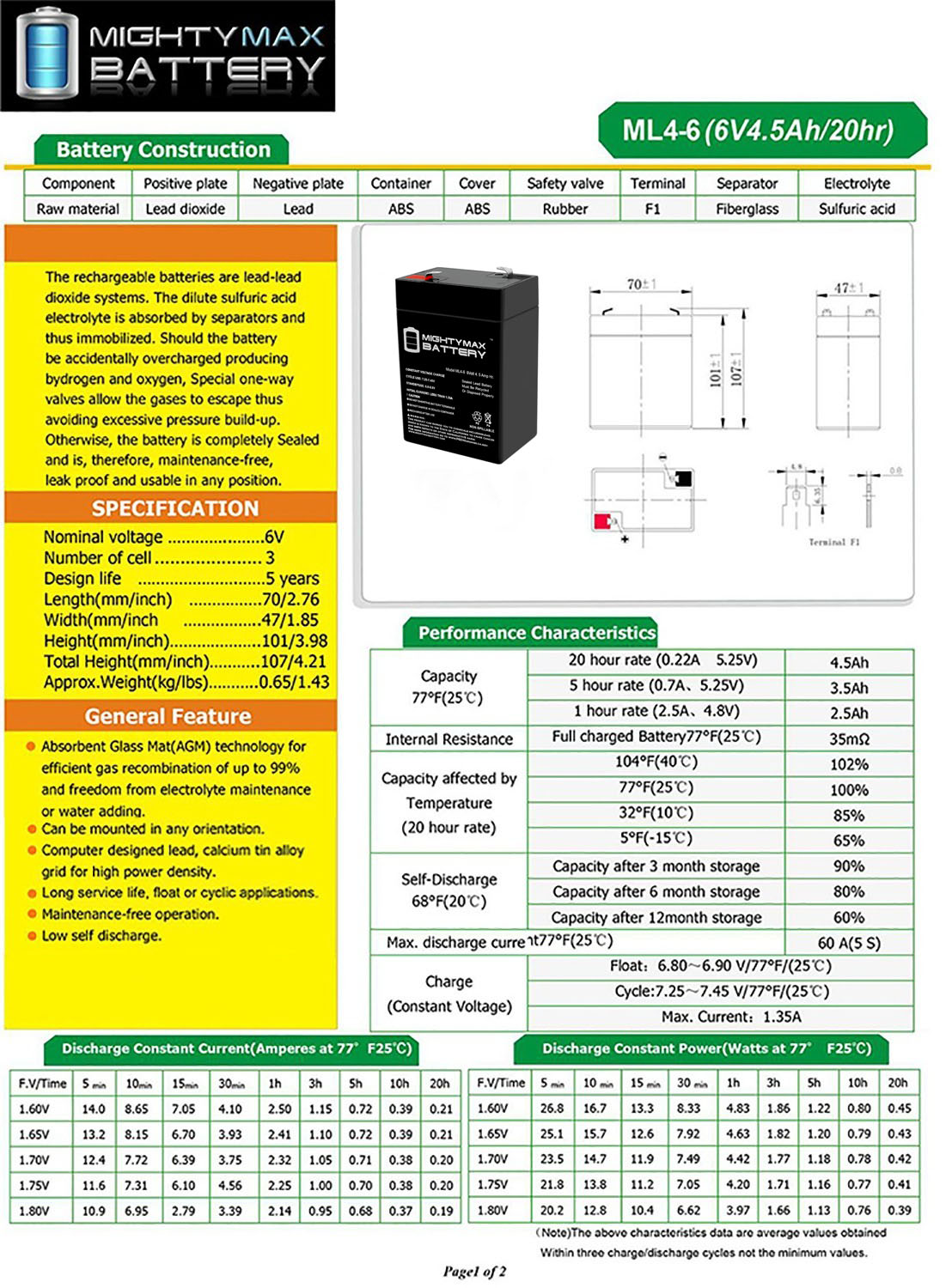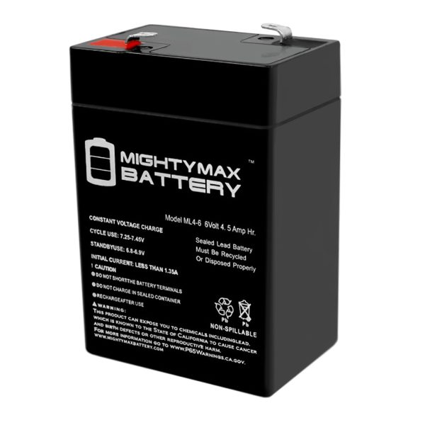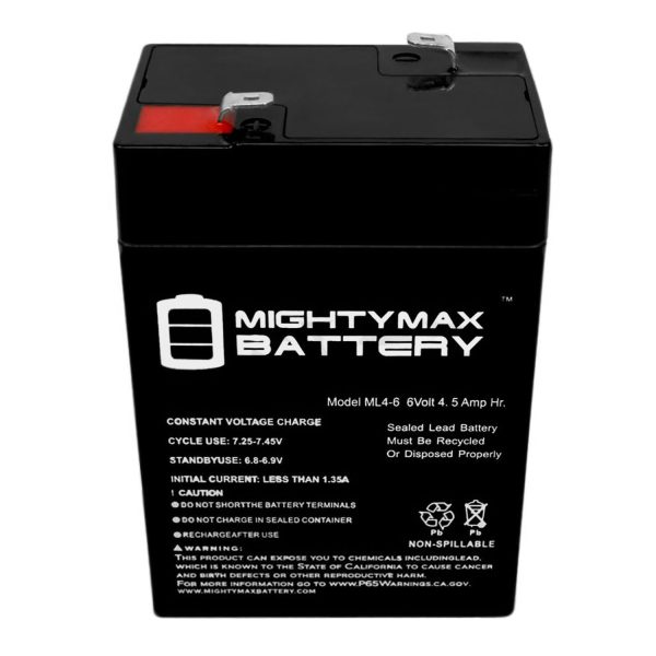 Delivering power when you need it, the Mighty Max ML4-6 6 Volt 4.5 AH uses a state of the art, heavy-duty, calcium-alloy grid that provides exceptional performance and service life in both float and cyclic applications.
