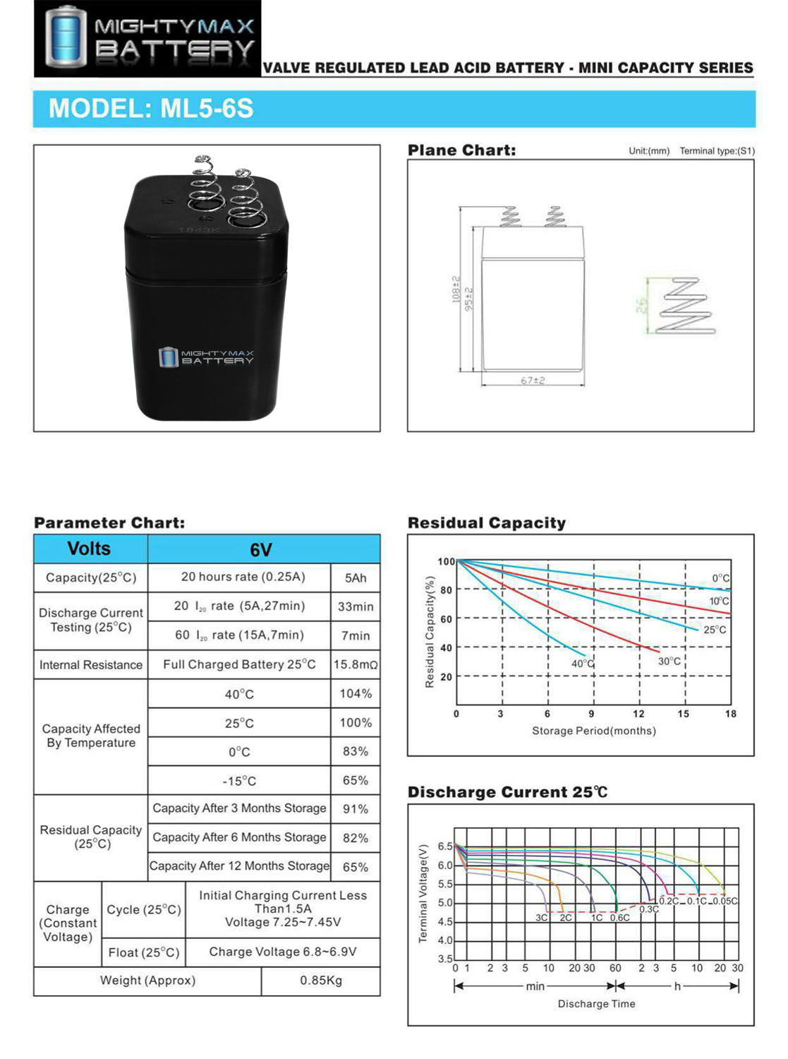 Delivering power when you need it, the Mighty Max ML5-6 6 Volt 5 AH uses a state of the art, heavy-duty, calcium-alloy grid that provides exceptional performance and service life in both float and cyclic applications.