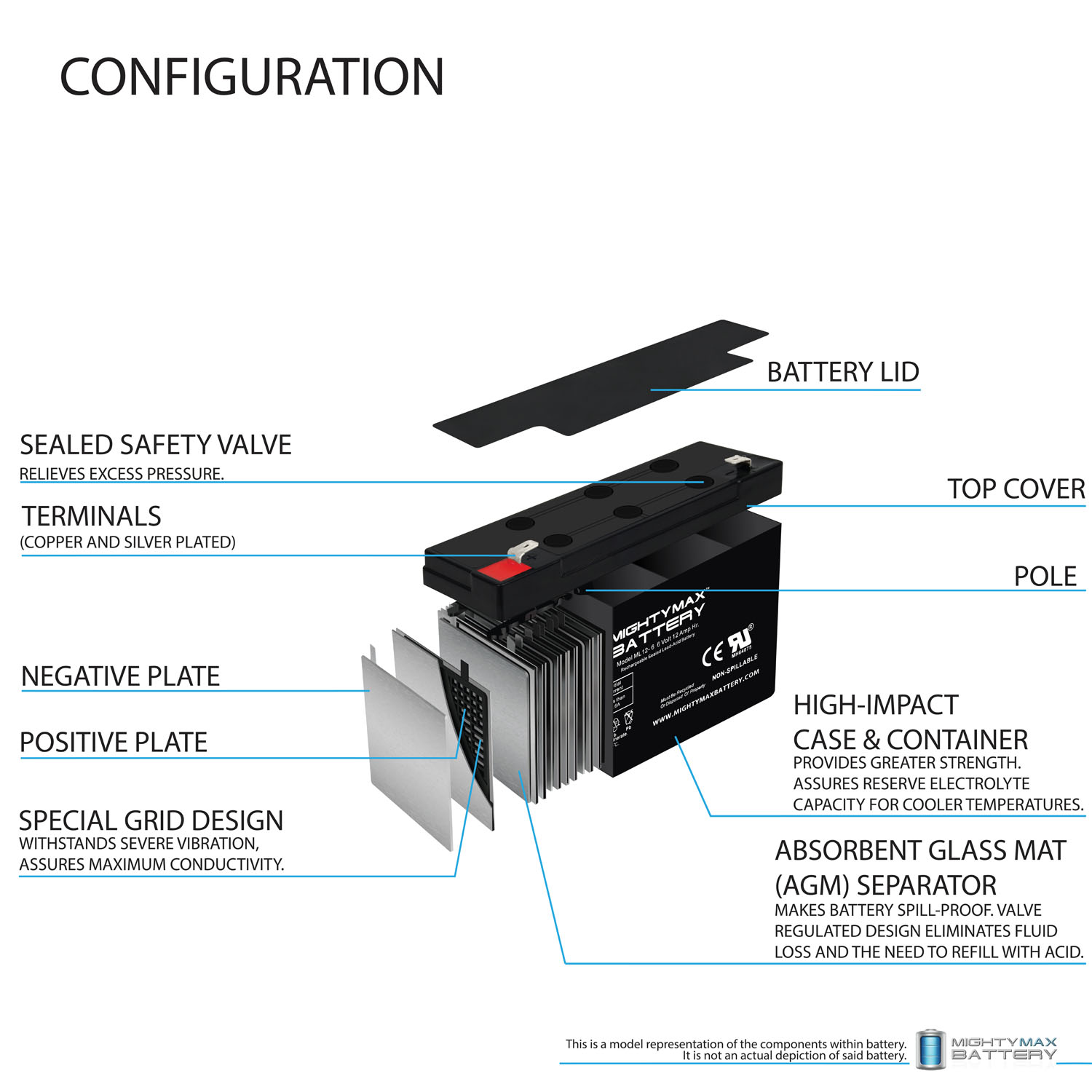 The ML12-6F2 is an Absorbent Glass Mat (AGM) technology with a valve regulated design, that can be used in enclosed and indoor environments without leaking or maintenance, providing a superior performance for thousands of models.