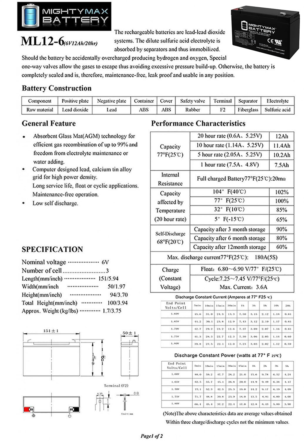 Delivering power when you need it, the Mighty Max ML12-6F2 6 Volt 12 AH uses a state of the art, heavy-duty, calcium-alloy grid that provides exceptional performance and service life in both float and cyclic applications.
