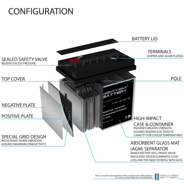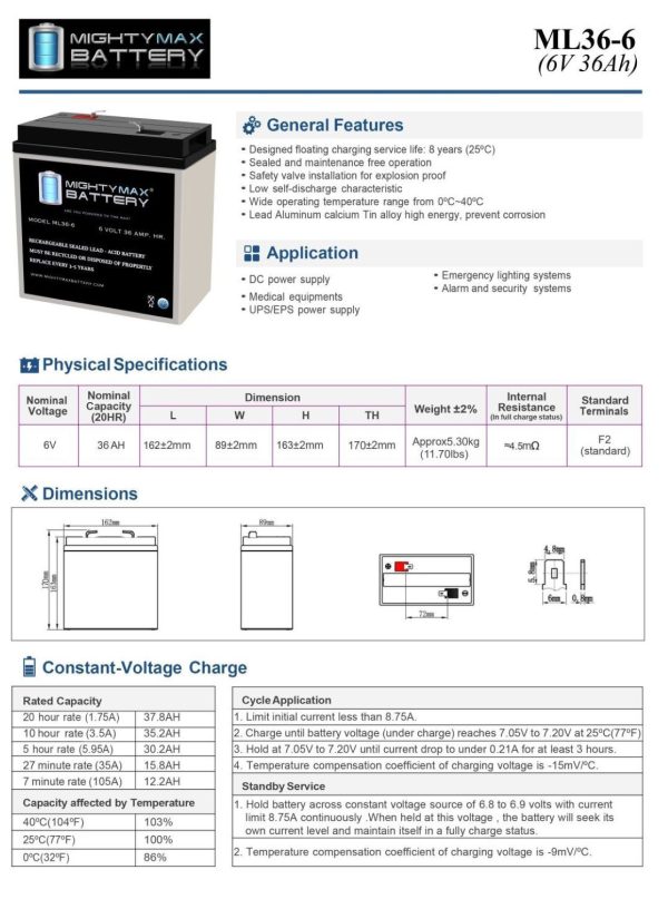 Delivering power when you need it, the Mighty Max ML36-6 6 Volt 36 AH uses a state of the art, heavy-duty, calcium-alloy grid that provides exceptional performance and service life in both float and cyclic applications.