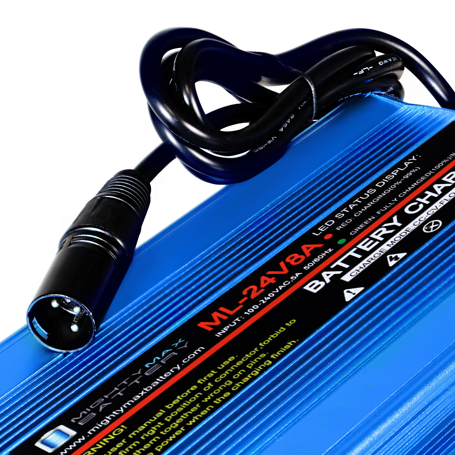 The Mighty Max automatic smart wheelchair battery charger comes with the round 3 pin XLR connector. The Mighty Max Charger provides an enhanced charging method that will not damage your batteries when left connected. Mighty Max 24V 8A charger also provides a short circuit protection, enabling the product to charge safely in most environments. Mighty Max 24V 8A charges 24V lead acid and Gel cell type Batteries. Most common use with the following wheelchairs: Pride Mobility, Hoveround, Freedom, DDC, Shoprider, E-Scooter Electra, Frank Mobility, Merits Health Products, Theradyne and many more.