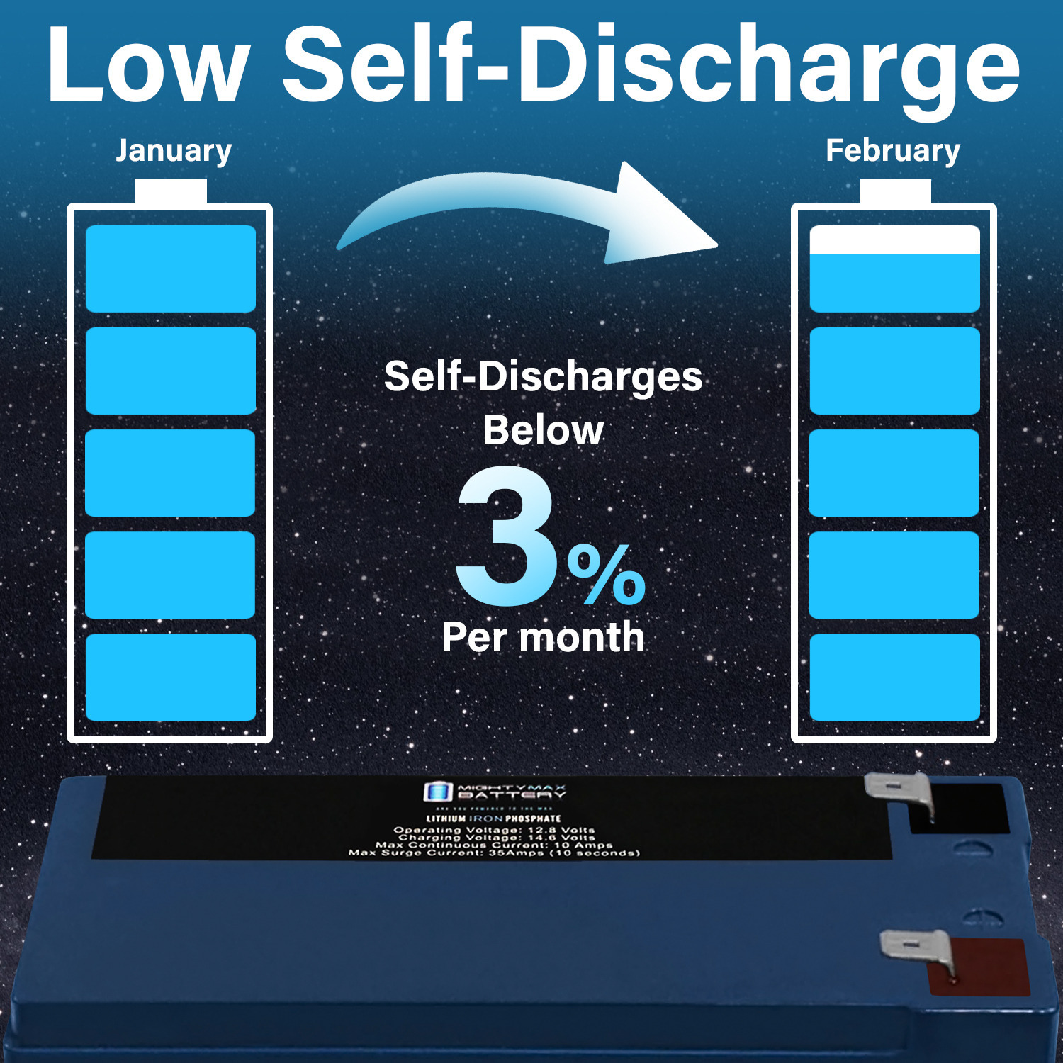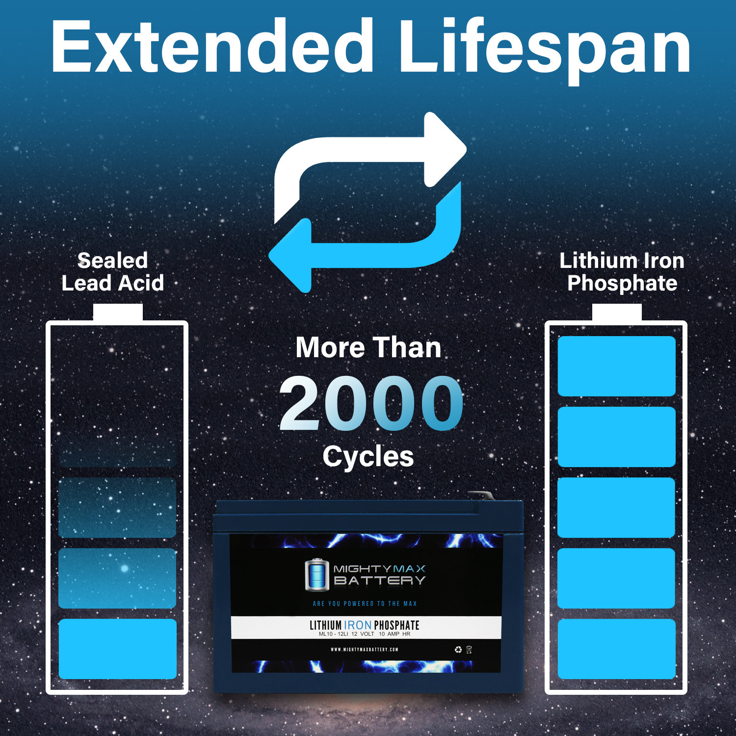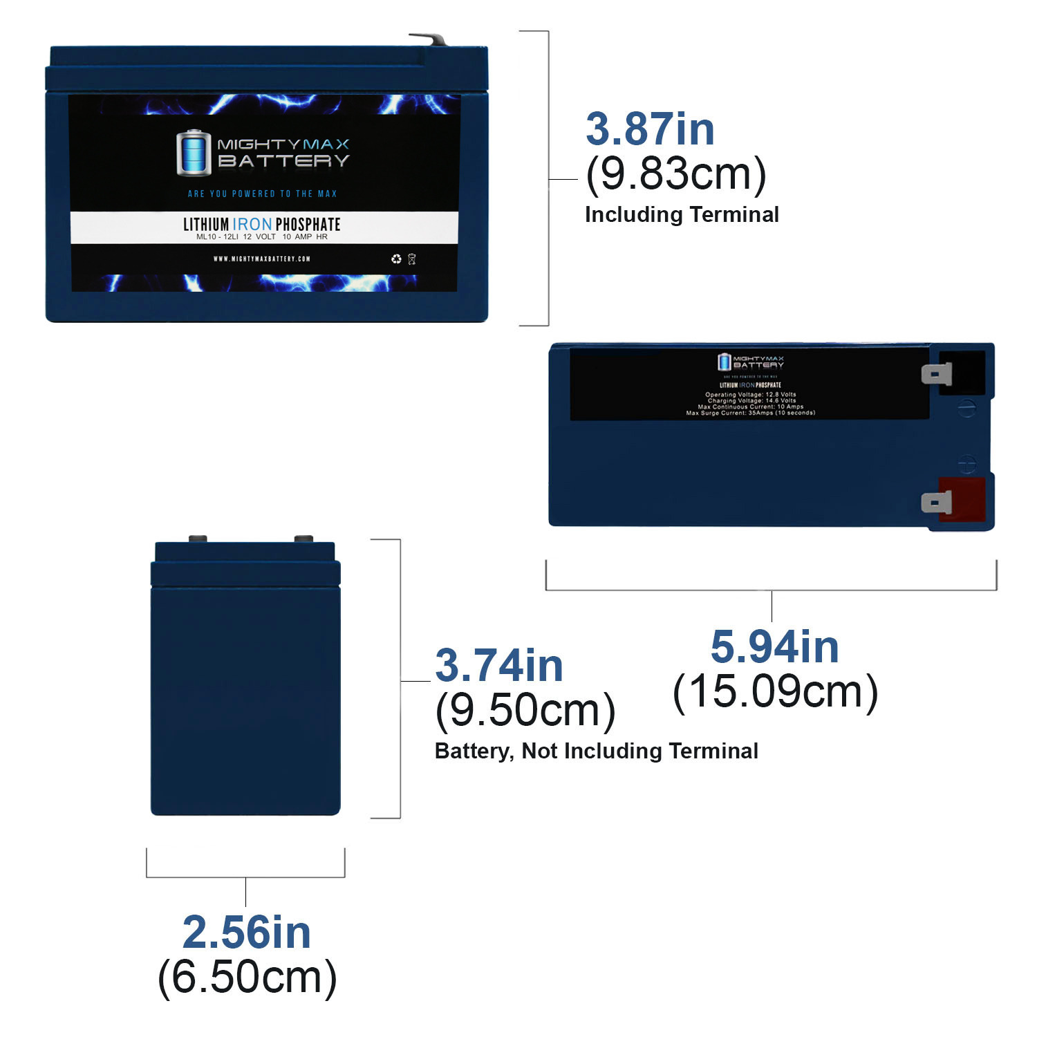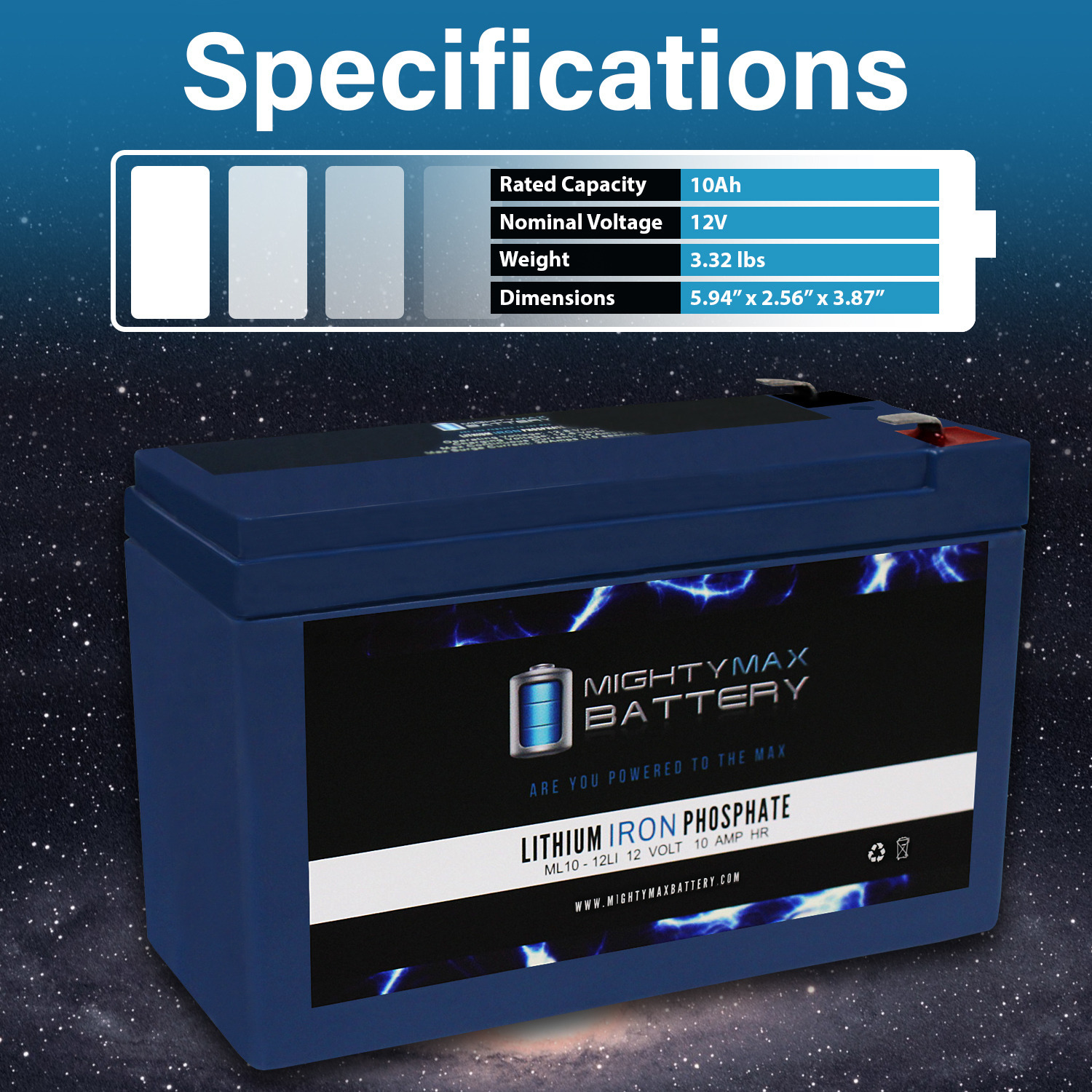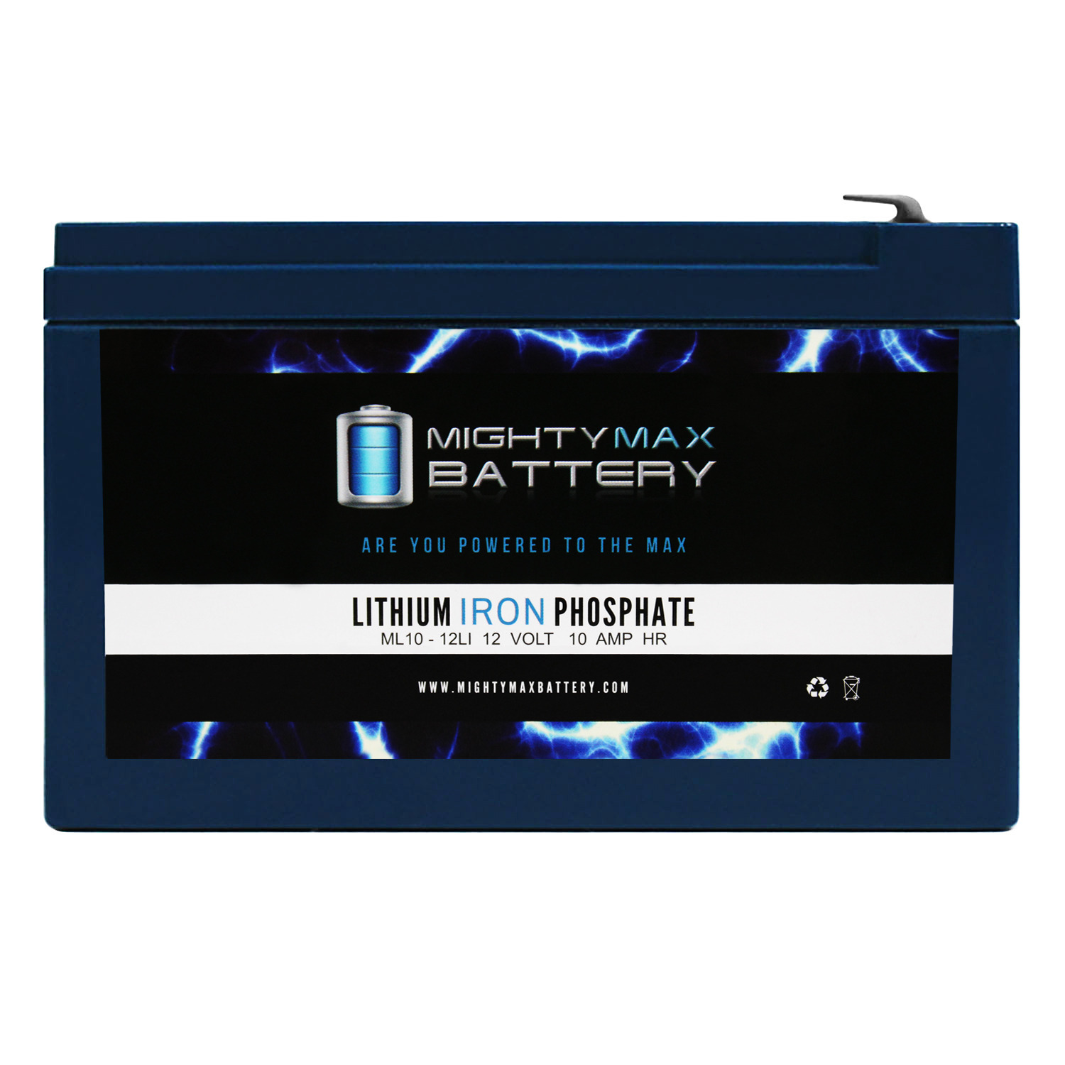 Invest in power with the Mighty Max 12V 10ah Lithium Iron Phosphate Battery. The ML10-12LI will take your deep cycle battery experience to a whole new horizon. Manufactured with the highest quality components and the customers safety in mind, this battery contains a battery management system (BMS). BMS provides all kinds of protection for the battery and customer, equipped with Over charge and short circuit protection. Weighing only 4.52 lbs. and being a direct drop in replacement for its sister sealed lead acid and Gel batteries which weigh a hefty 6.15 lbs. Lighter, stronger and longer life span with 2500 cycles makes this the ideal battery for all your Deep Cycle applications such as, Solar / wind  energy systems, Off Grid systems, RV, Camping, Backup power systems and much more.