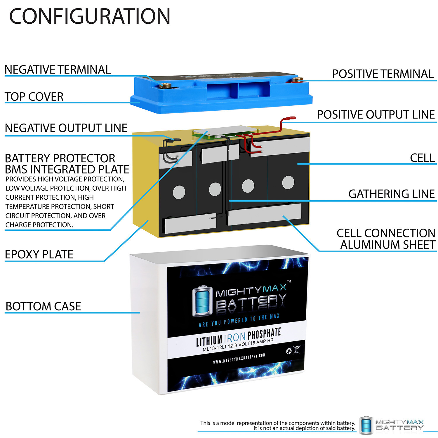 Invest in power with the Mighty Max 12V 18ah Lithium Iron Phosphate Battery. The ML18-12LI will take your deep cycle battery experience to a whole new horizon. Manufactured with the highest quality components and the customers safety in mind, this battery contains a battery management system (BMS). BMS provides all kinds of protection for the battery and customer, equipped with Over charge and short circuit protection. Weighing only 8.00 lbs. and being a direct drop in replacement for its sister sealed lead acid and Gel batteries which weigh a hefty 12.00 lbs. Lighter, stronger and longer life span with 2500 cycles makes this the ideal battery for all your Deep Cycle applications such as, Solar / wind  energy systems, Off Grid systems, RV, Camping, Backup power systems and much more.