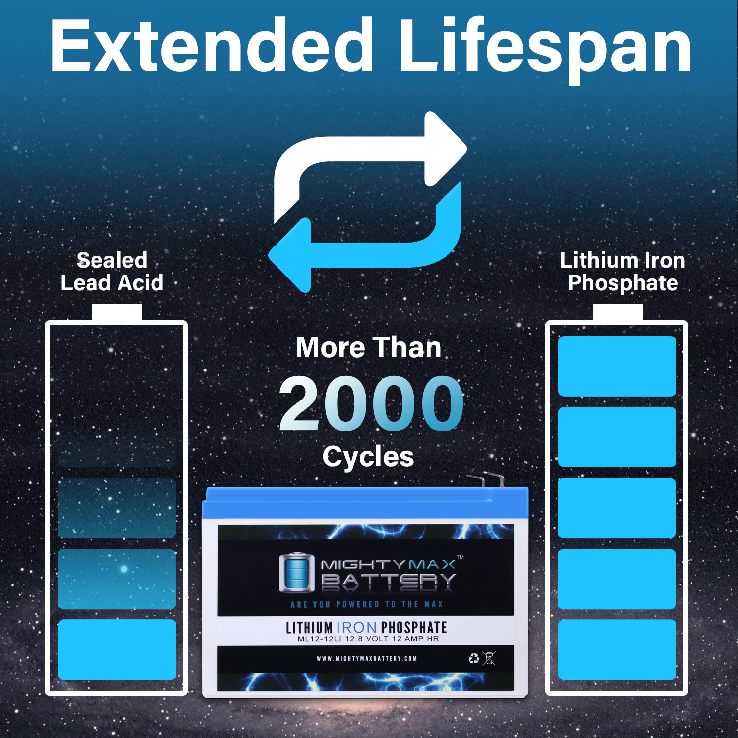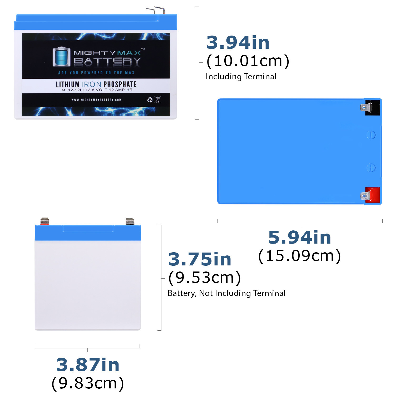 Invest in power with the Mighty Max 12V 12ah Lithium Iron Phosphate Battery. The ML12-12LI will take your deep cycle battery experience to a whole new horizon. Manufactured with the highest quality components and the customers safety in mind, this battery contains a battery management system (BMS). BMS provides all kinds of protection for the battery and customer, equipped with Over charge and short circuit protection. Weighing only 3.47 lbs. and being a direct drop in replacement for its sister sealed lead acid and Gel batteries which weigh a hefty 8.15 lbs. Lighter, stronger and longer life span with 2500 cycles makes this the ideal battery for all your Deep Cycle applications such as, Solar / wind energy systems, Off Grid systems, RV, Camping, Backup power systems and much more.