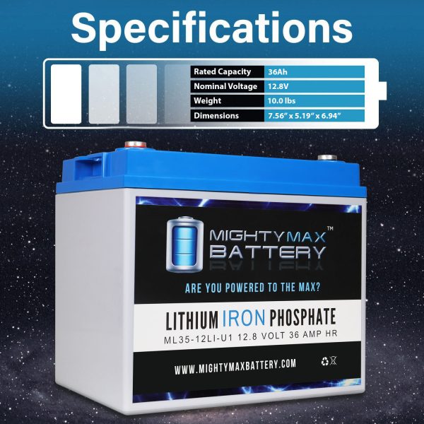 Invest in power with the Mighty Max 12V 35ah U1 Lithium Iron Phosphate Battery. The ML35-12LI-U1 will take your deep cycle battery experience to a whole new horizon. Manufactured with the highest quality components and the customers safety in mind, this battery contains a battery management system (BMS). BMS provides all kinds of protection for the battery and customer, equipped with Over charge and short circuit protection. Weighing only 10.00 lbs. and being a direct drop in replacement for its sister sealed lead acid and Gel batteries which weigh a hefty 24.00 lbs.