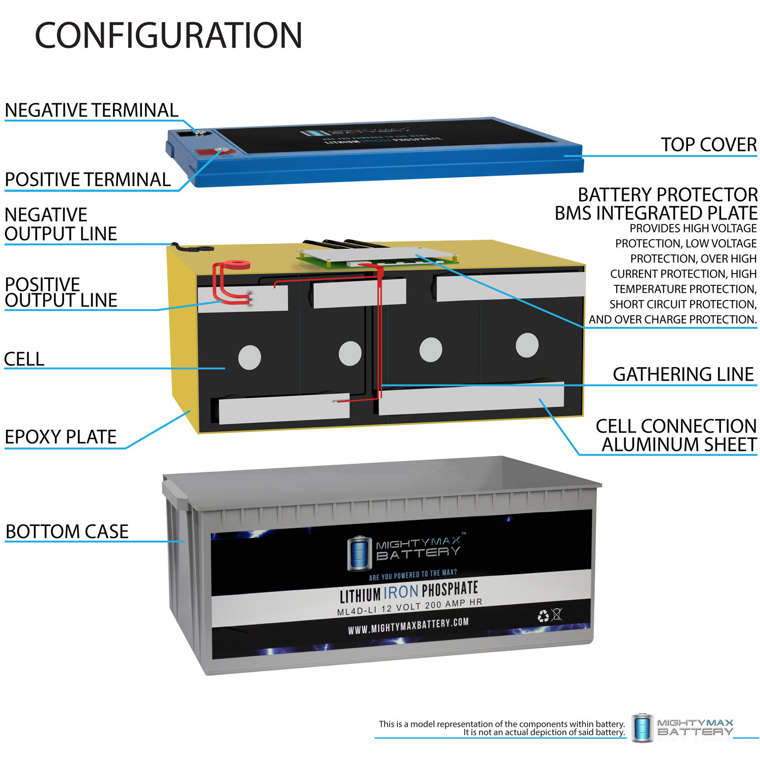 Invest in power with the Mighty Max 12V 200ah Lithium Iron Phosphate Battery. The ML4D-LI will take your deep cycle battery experience to a whole new horizon. Manufactured with the highest quality components and the customers safety in mind, this battery contains a battery management system (BMS). BMS provides all kinds of protection for the battery and customer, equipped with Over charge and short circuit protection. Weighing only 48.00 lbs. and being a direct drop in replacement for its sister sealed lead acid and Gel batteries which weigh a hefty 114 lbs. Lighter, stronger and longer life span with 2500 cycles makes this the ideal battery for all your Deep Cycle applications such as, Solar / wind energy systems, Off Grid systems, RV, Camping, Backup power systems and much more.