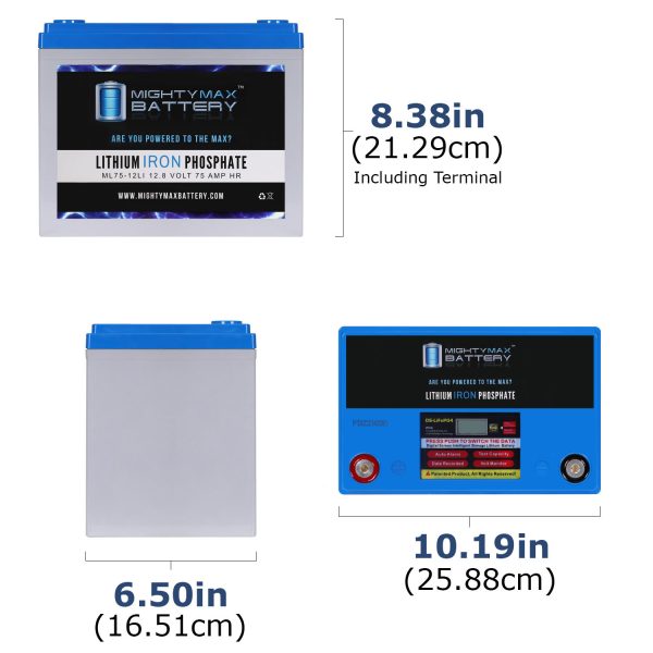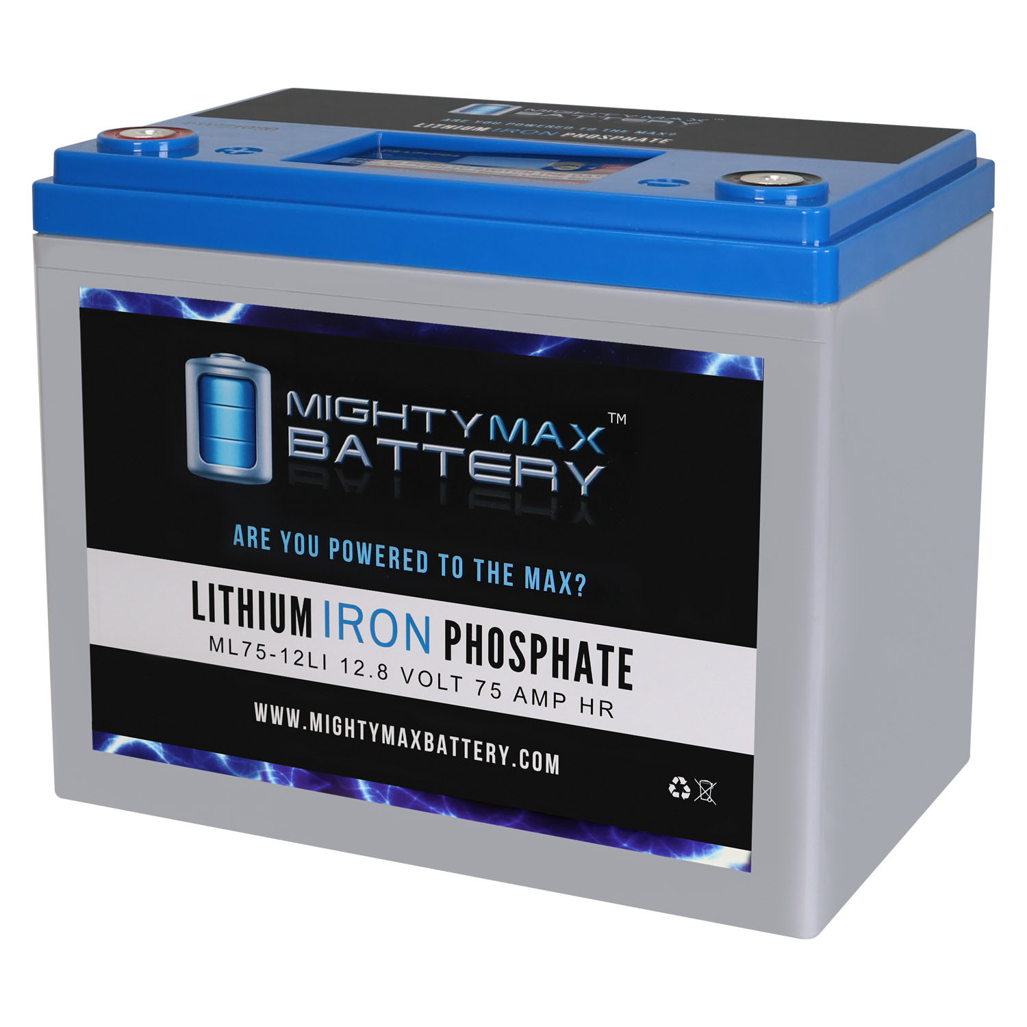Invest in power with the Mighty Max 12V 75ah Lithium Iron Phosphate Battery. The ML75-12LI will take your deep cycle battery experience to a whole new horizon. Manufactured with the highest quality components and the customers safety in mind, this battery contains a battery management system (BMS). BMS provides all kinds of protection for the battery and customer, equipped with Over charge and short circuit protection. Weighing only 23.00 lbs. and being a direct drop in replacement for its sister sealed lead acid and Gel batteries which weigh a hefty 50 lbs. Lighter, stronger and longer life span with 2500 cycles makes this the ideal battery for all your Deep Cycle applications such as, Solar / wind  energy systems, Off Grid systems, RV, Camping, Backup power systems and much more.