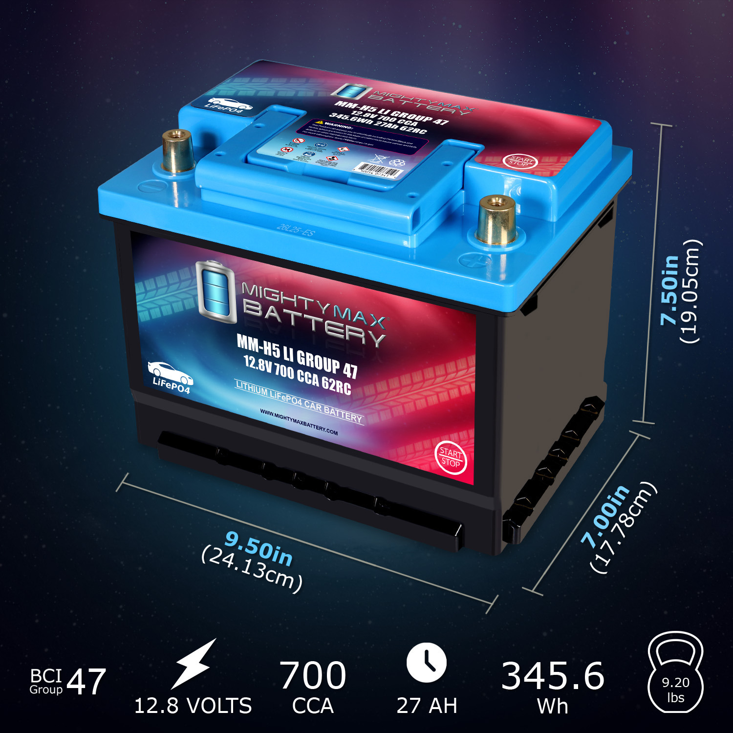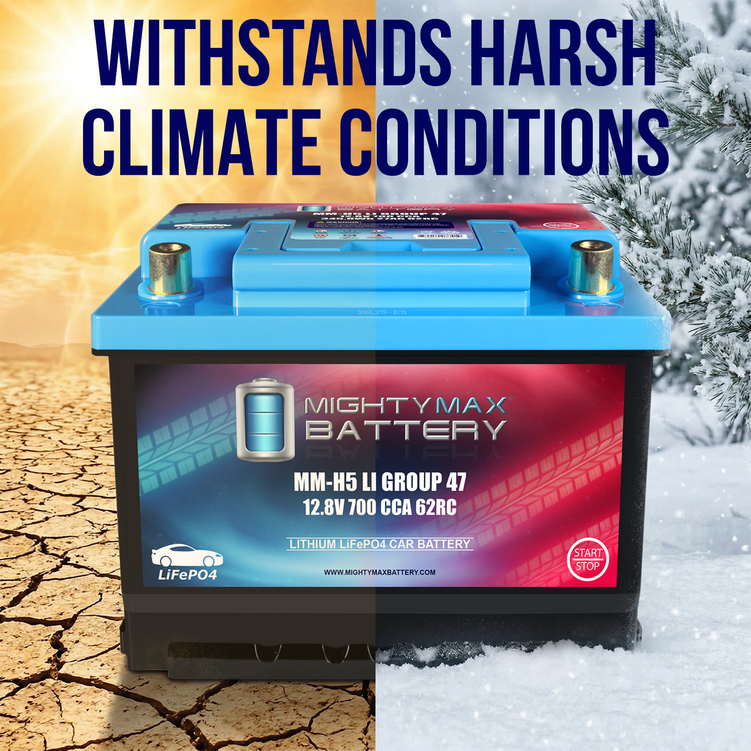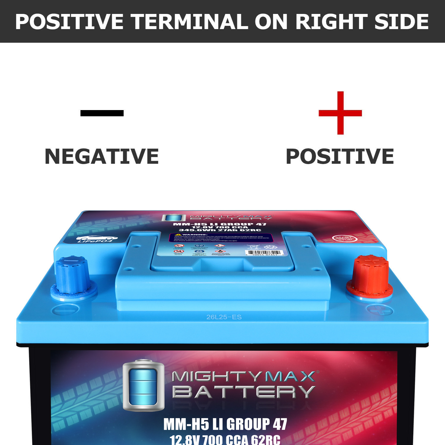 This Group Size 47 lithium battery stands ready with dependable starting power for the conditions drivers face every day. With 12.8V, 27Ah, 700 Cold Cranking Amps, and a 62-minute Reserve Capacity, it provides strong starts and the endurance to support your vehicle’s electrical demands. It’s built for strong starts on freezing mornings, dependable performance in extreme temperatures, and the kind of power that keeps up with modern vehicles.