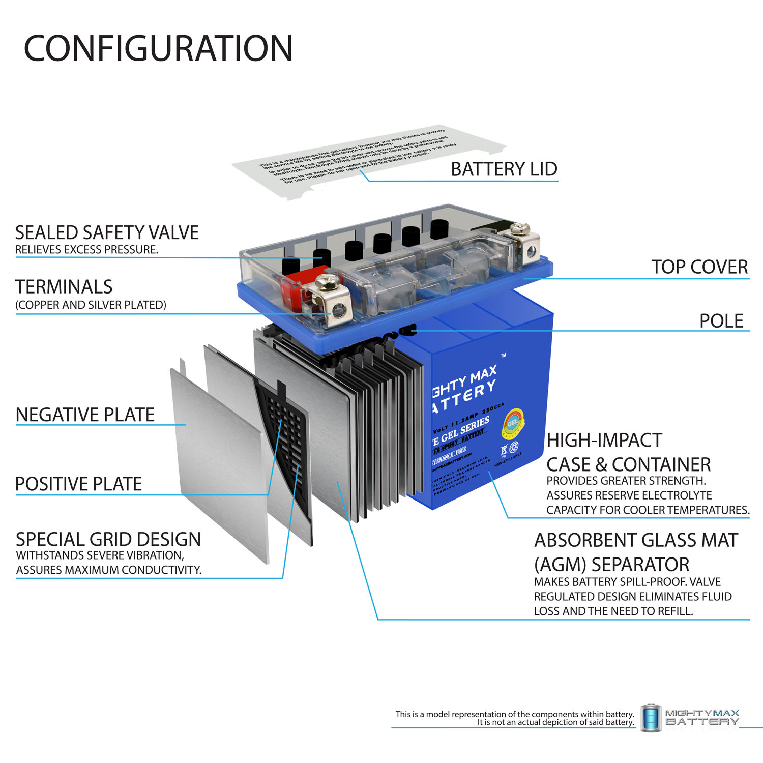 The YTZ14SGEL is a 12V 11.2AH GEL (Maintenance Free) battery. Requires no addition of water during the life of the battery. The Mighty Max YTZ14SGEL is a TRUE DEEP CYCLE battery that can be mounted in any position, requires no maintenance. When a Gel Cell battery is charged, no hazardous fumes escape the battery case, gases are processed within the battery itself.