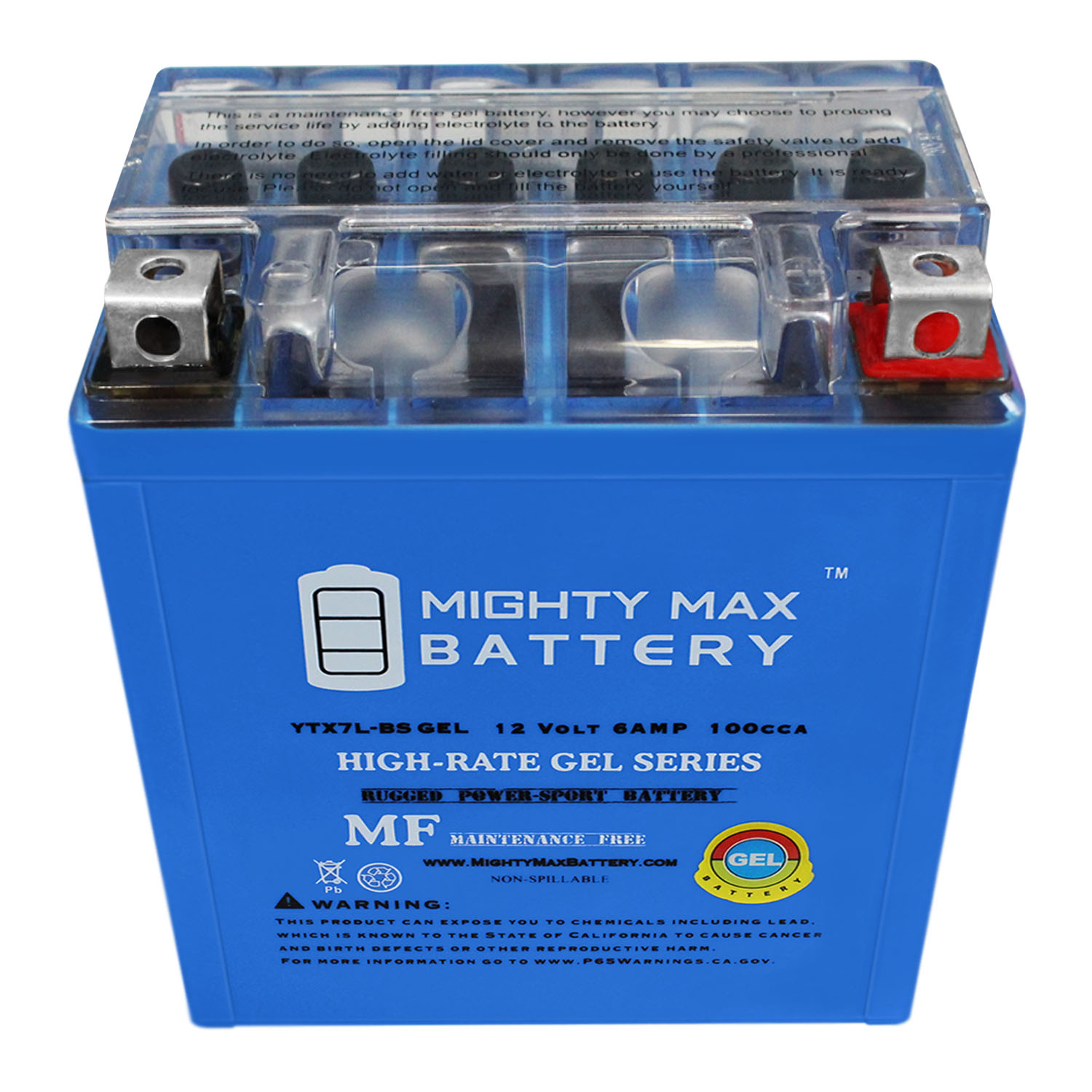 The YTX7L-BSGEL is a 12V 6AH GEL (Maintenance Free) battery. Requires no addition of water during the life of the battery. The Mighty Max YTX7L-BSGEL is a TRUE DEEP CYCLE battery that can be mounted in any position, requires no maintenance. When a Gel Cell battery is charged, no hazardous fumes escape the battery case, gases are processed within the battery itself.