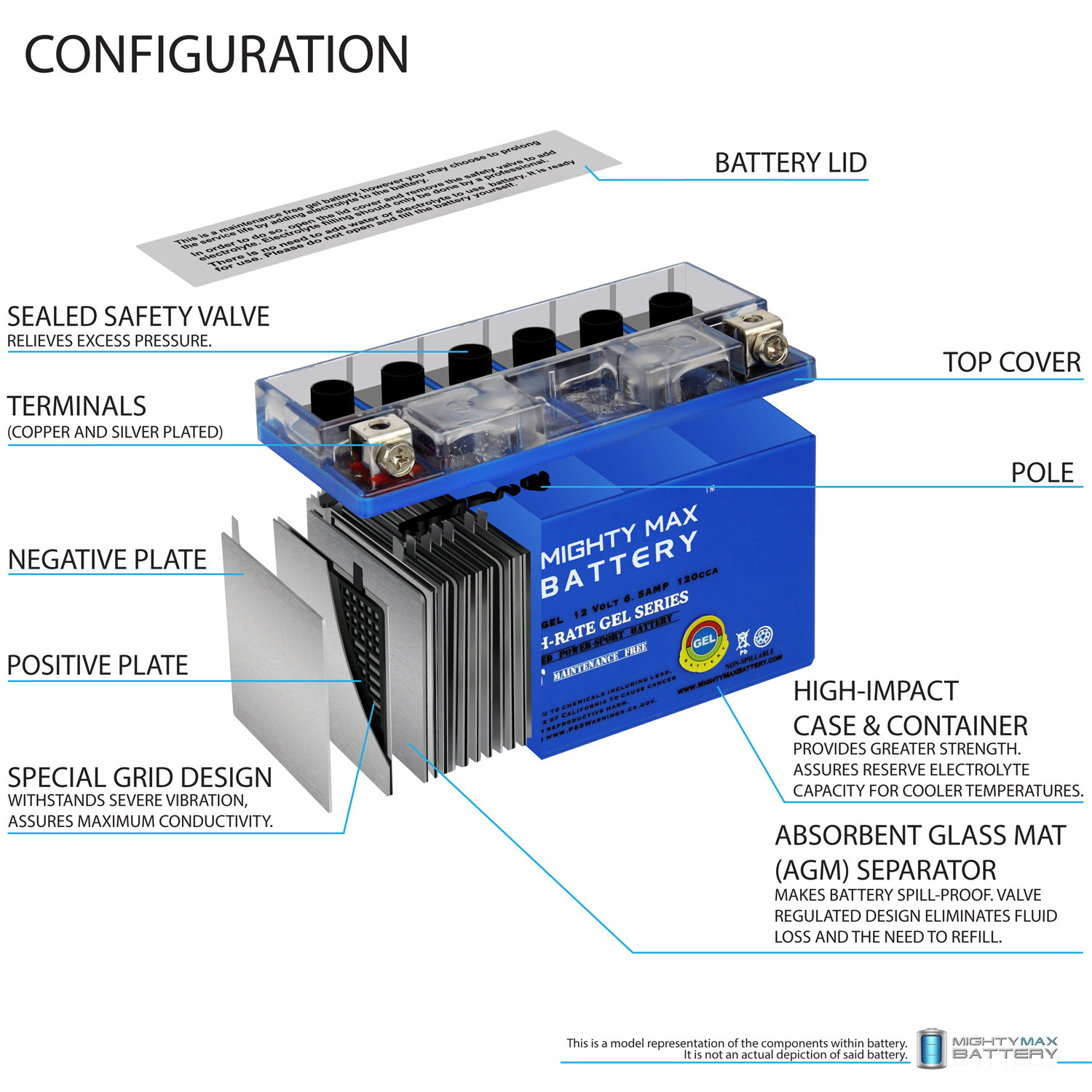 The YT7B-BSGEL is a 12V 6.5AH GEL (Maintenance Free) battery. Requires no addition of water during the life of the battery. The Mighty Max YT7B-BSGEL is a TRUE DEEP CYCLE battery that can be mounted in any position, requires no maintenance. When a Gel Cell battery is charged, no hazardous fumes escape the battery case, gases are processed within the battery itself.