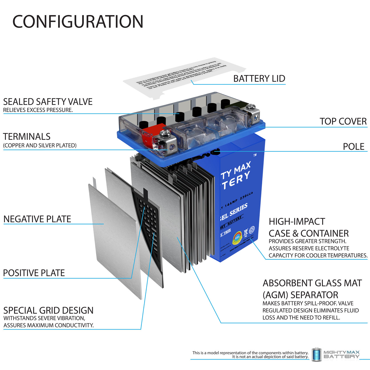 The YTX16-BS GEL is a 12V 14AH GEL (Maintenance Free) battery. Requires no addition of water during the life of the battery. The Mighty Max YTX16-BS GEL is a TRUE DEEP CYCLE battery that can be mounted in any position, requires no maintenance. When a Gel Cell battery is charged, no hazardous fumes escape the battery case, gases are processed within the battery itself.