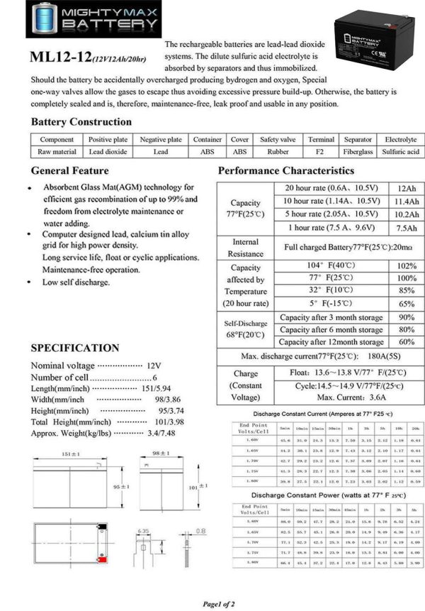 Delivering power when you need it, the Mighty Max ML12-12F2 12 Volt 12 AH uses a state of the art, heavy-duty, calcium-alloy grid that provides exceptional performance and service life in both float and cyclic applications.