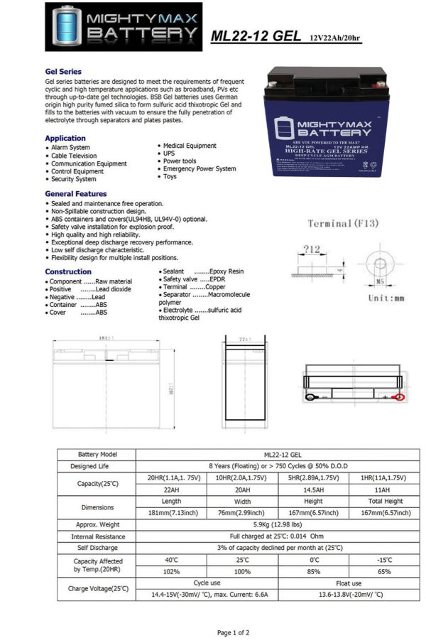 Delivering power when you need it, the Mighty Max ML22-12GEL 12 Volt 22 AH (Maintenance Free) battery. Requires no addition of water during the life of the battery. The Mighty Max ML22-12 GEL is a TRUE DEEP CYCLE battery that can be mounted in any position, requires no maintenance. When a Gel Cell battery is charged, no hazardous fumes escape the battery case, gases are processed within the battery itself.