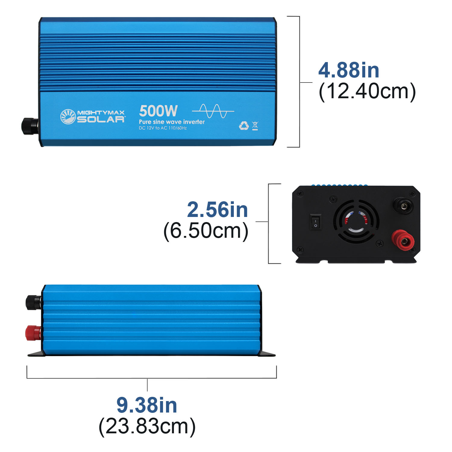 Mighty Max Solar is proud to bring you the MLS-500PSW, a 12 Volt 500 watt pure sine wave inverter. The MLS-500PSW works by converting your batteries stored DC power into household AC power for your common consumer electronics. The Mighty max 500 watt pure sine wave inverter Produces cleaner, smoother, quieter, and more reliable Power to operate your electronics without any interference. This inverter delivers optimal performance for all off grid and solar applications. For optimal performance the MLS-500PSW 12v 500w inverter works best with a Mighty Max solar panel, charge controller, and a Mighty Max battery.