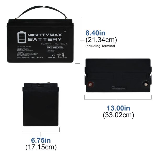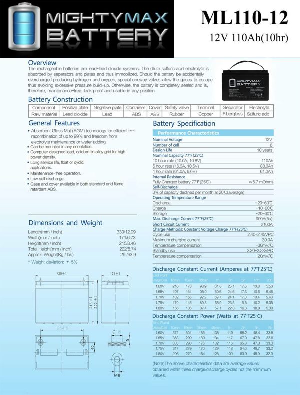 Delivering power when you need it, the Mighty Max ML110-12 Internal Thread 12 Volt 110 AH uses a state of the art, heavy-duty, calcium-alloy grid that provides exceptional performance and service life in both float and cyclic applications.