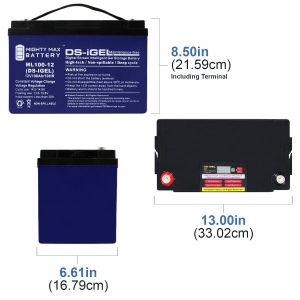 Delivering power when you need it, the Mighty Max ML100-12GEL 12 Volt 100 AH (Maintenance Free) battery. Requires no addition of water during the life of the battery. The Mighty Max ML100-12 GEL is a TRUE DEEP CYCLE battery that can be mounted in any position, requires no maintenance. When a Gel Cell battery is charged, no hazardous fumes escape the battery case, gases are processed within the battery itself.