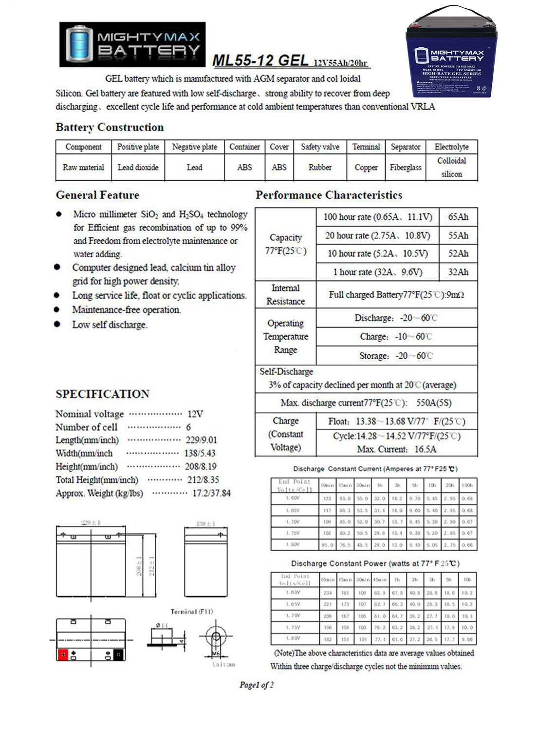 Delivering power when you need it, the Mighty Max ML55-12GEL 12 Volt 55 AH (Maintenance Free) battery. Requires no addition of water during the life of the battery. The Mighty Max ML55-12 GEL is a TRUE DEEP CYCLE battery that can be mounted in any position, requires no maintenance. When a Gel Cell battery is charged, no hazardous fumes escape the battery case, gases are processed within the battery itself.