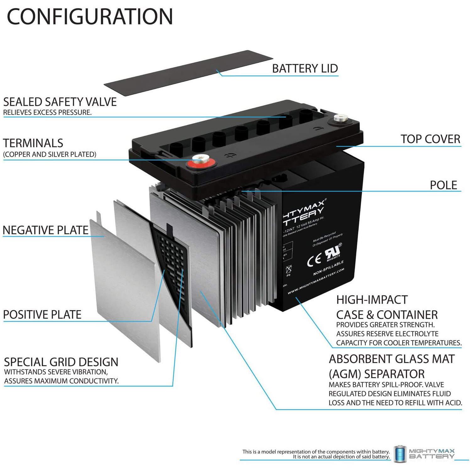 The ML55-12 Internal Thread is an Absorbent Glass Mat (AGM) technology with a valve regulated design, that can be used in enclosed and indoor environments without leaking or maintenance, providing a superior performance for thousands of models.