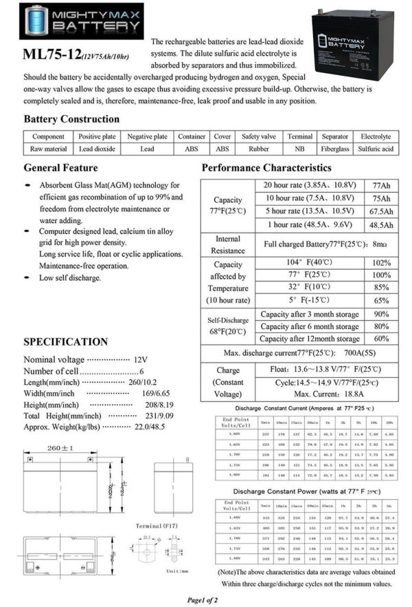 Delivering power when you need it, the Mighty Max ML75-12 12 Volt 75 AH uses a state of the art, heavy-duty, calcium-alloy grid that provides exceptional performance and service life in both float and cyclic applications.